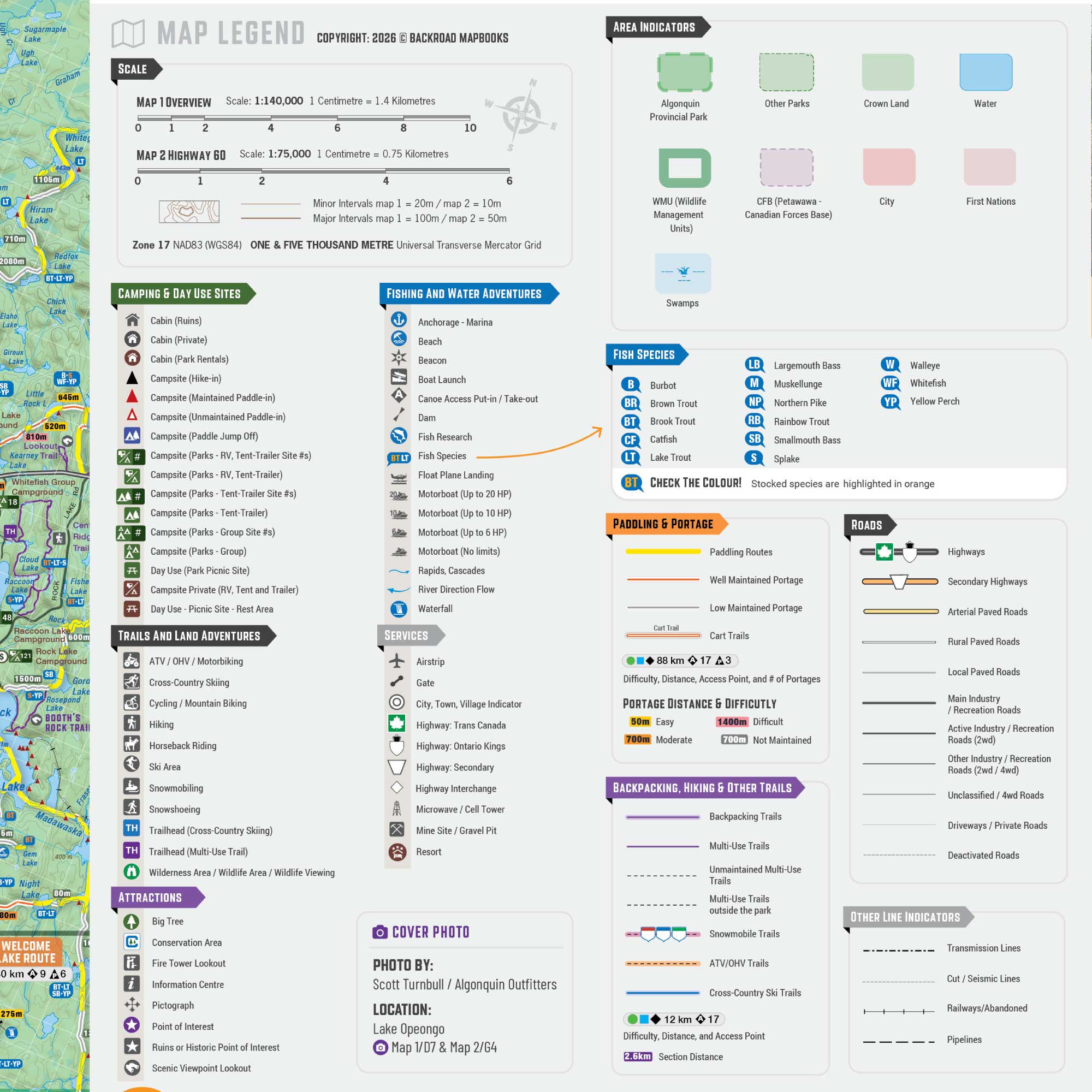 To help you make the most of your time in this incredible park, the Backroad Mapbooks team has put together a two-in-one park map with an unparalleled level of detail. This next-generation park map covers the entire park area on one side, with all of its canoe routes, campsites, portages and trails. The other side of the map focuses specifically on the Highway 60 Corridor and the nearly overwhelming amount of adventures and activities you can access along this main corridor. This map also includes helpful planning tools like a canoe route chart (complete with distance and difficulty), trail chart, campsite details, stocked fish chart and more. The map also includes numerous updates from our previous version, including the addition of labelled sportfish species. Best of all, this 71 cm x 102 cm (28 in x 40 in) map is printed on durable waterproof paper and represents the height of cartographic sophistication with easy-to-read colour coding and industry-leading topographic detail. You will not find a better guide to Algonquin Park anywhere!