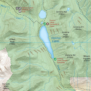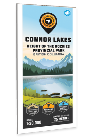 Highlighting the Connor Lakes area of Height of the Rockies Provincial Park BC, highlights all the hiking trails and recreation features in the area. Use for fishing, camping, hiking, biking, exploring, canoeing, kayaking, backcountry skiing, wildlife viewing and more! Using 1:10,000 scale data, this map features our industry-leading topographic contours and relief shading, providing you with more detail than any other recreation map of the park. Included on the map are Connor Lakes, Forsyth Creek, Goat Lake, Maiyuk Creek, Mount Ingram, Mount Lancaster, Mount Minton, Mount Marconi, O'Neil Peak, Quarrie Creek and more!