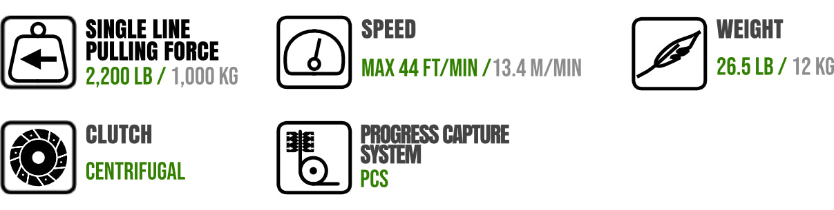 Features the GX50 engine by Honda, an all-position engine. This winch also stands out by providing perfect control over the movement of a load with the Progress Capture System