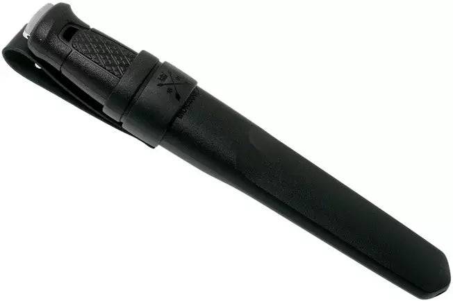Garberg (S) is a durable survival knife with a full-tang construction that runs through the handle. The exposed tang at the rear can be used for batoning, scraping, or striking a ferro rod. The 3.2 mm thick blade is made of Swedish stainless steel and features a ground spine that is compatible with ferro rod.