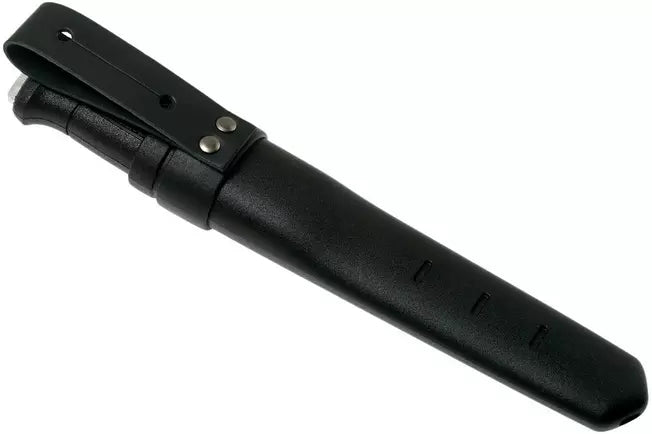 The molded handle features a traditional Dala pattern and finger guard for a secure grip. The polymer sheath is ambidextrous and fits both right- and left-handed users and includes a practical belt loop.