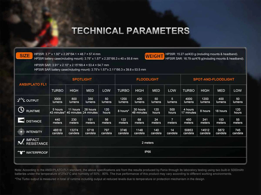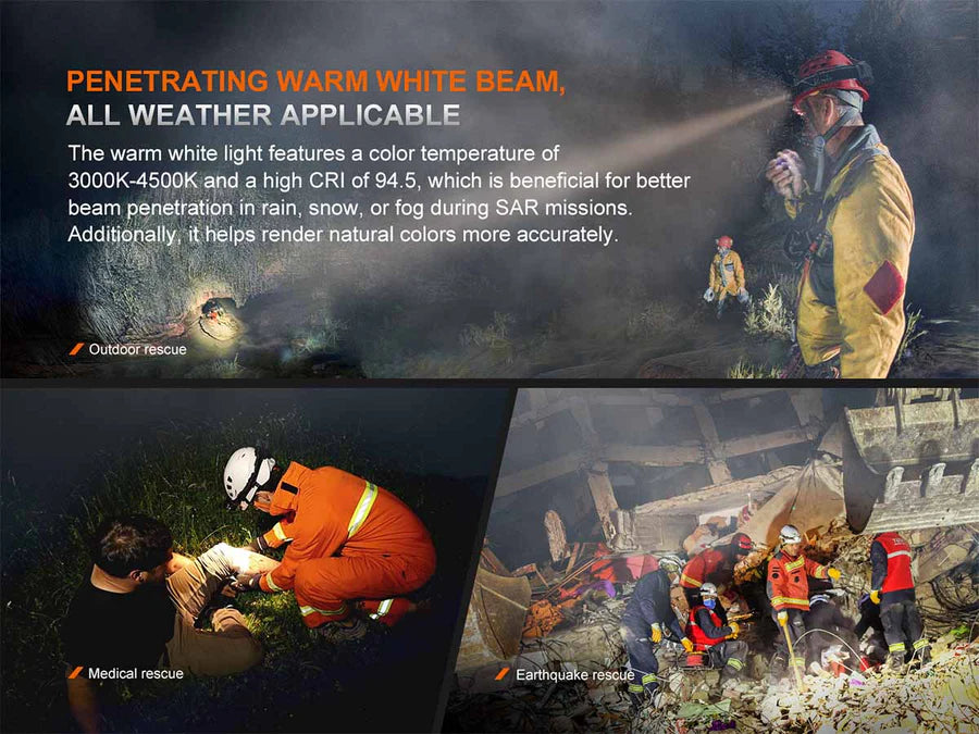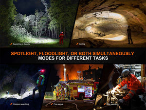Made for the professional and built for the extremes, the Fenix HP35R Rechargeable Professional Headlamp is built to perform. The rotary and button combo switch allows you to choose between different levels of spotlight, floodlight, or both—for a jaw-dropping 4000 max lumens with an almost 500-yard throw. The battery pack contains two built-in 5000mAh batteries and can be used as a power bank to charge other devices. Built into the battery case is a red safety light used for alerting others to your location. The SAR edition comes with a heat-resistant silicon strap, helmet mount, and helmet clips, whereas the standard version has a perforated black-out strap.