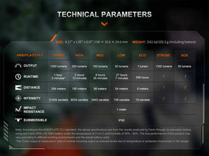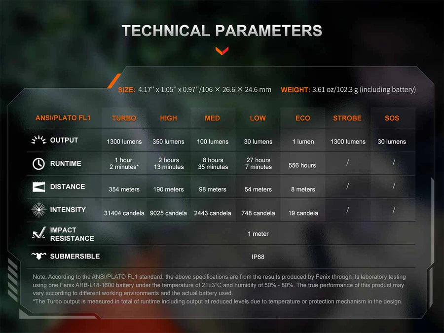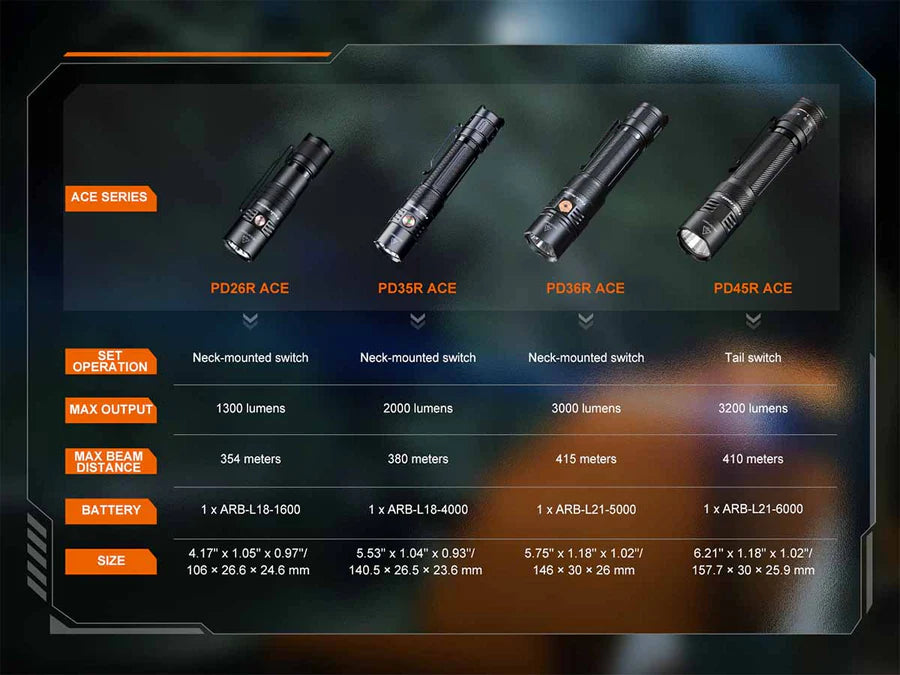The PD26R ACE is the most compact ACE flashlight yet! At just 4.17 inches long and 3.61 ounces, it slips easily into a pocket or bag, but packs major punch. With an impressive 1300 lumens that can reach 1161 feet (354 meters), this light proves big performance can come in small packages.