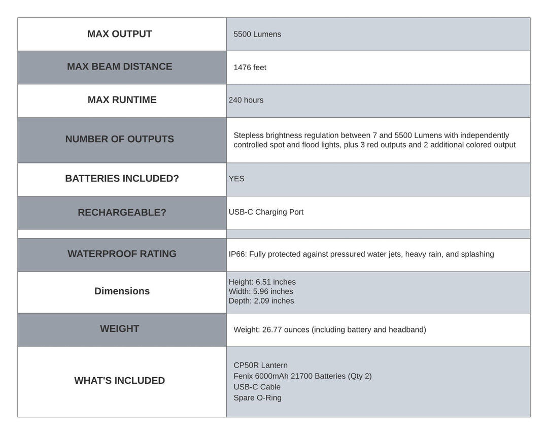 The Fenix CP50R Road Hazard Camping Lantern is built to perform in the most demanding conditions, whether you’re lighting up a campsite, signaling for roadside emergencies, or working in low-light environments. With a 5500-lumen maximum output and a beam distance reaching up to 1476 feet, this powerhouse ensures you’ll never be left in the dark. Choose between spotlight, floodlight, or a combination of both, with stepless brightness regulation from 7 to 5500 lumens giving you complete control over your lighting environment.