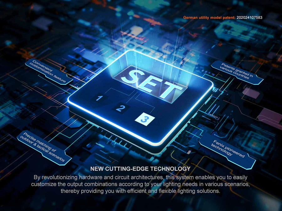 With the light turned on, single click the SET switch to cycle through Option 1 (1 output)→Option 2 (3 outputs)→Option 3 (5 outputs). When users turn on the flashlight for the first time, Option 3 will be selected by default.