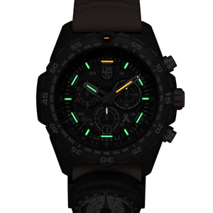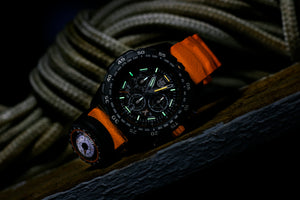 La série MASTER comprend deux chronographes dotés d'un boîtier CARBONOX+™ de 45 mm orné de détails orange, dont un SOS en morse pour une localisation rapide. Les poussoirs du chronographe sont en acier inoxydable massif et la couronne, également en acier inoxydable, est munie d'une bague en caoutchouc orange pour une prise en main optimale. Cette montre d'exception est étanche à 300 mètres et possède un verre saphir traité antireflet. Elle est livrée avec un bracelet en caoutchouc noir et est équipée d'une boussole intégrée.
