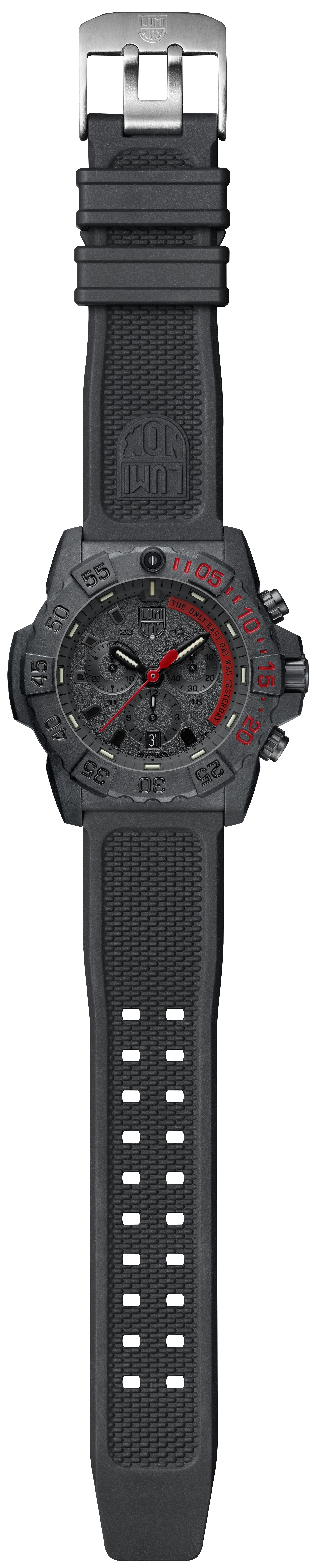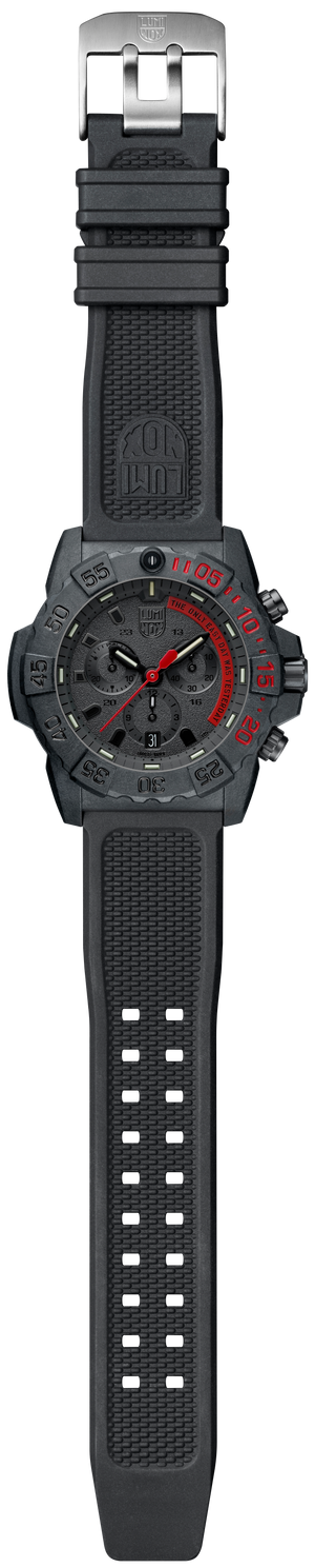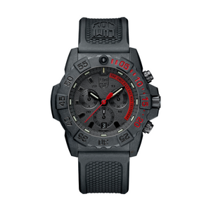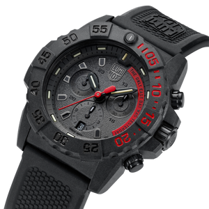 Le chronographe Luminox Navy SEAL « The Only Easy Day was Yesterday » (Le seul jour facile, c'était hier). Boîtier CARBONOX™ de 45 mm, lunette de plongée et étanchéité jusqu'à 200 mètres. La devise des Navy SEALs se détache en rouge sur le cadran noir. Équipé du système d'éclairage Luminox Light Technology, il offre une visibilité optimale, indépendante de toute source d'énergie, jusqu'à 25 ans.